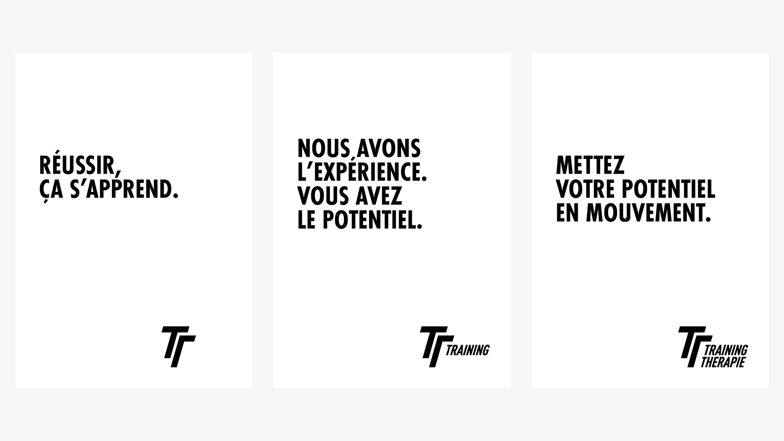 Pour accompagner ce virage, nous avons construit une plateforme de marque qui s’adresse à tous ceux qui croient au pouvoir du mouvement, sur leur santé, leur performance physique et mentale, pour se soigner ou se dépasser dans leur vie professionnelle comme personnelle. Training Thérapie devient alors une marque corporate forte, incarnée par des pros du soin et du sport engagés. L’incarnation d’une nouvelle approche, à la croisée du BtoB et du BtoC, où le mouvement devient un langage commun entre soin et performance.